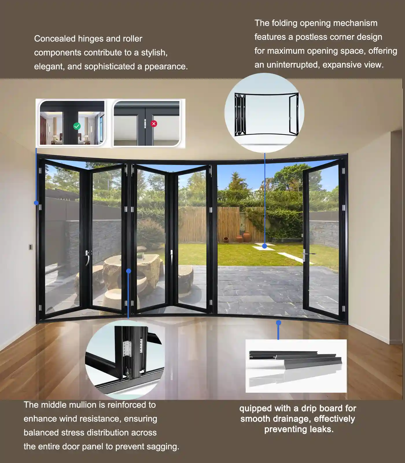 - Bi folding door consist of multiple door panels connected by hinges. They fold neatly along a track suspended at the top, stacking to one or both sides. When fully open, the walls disappear. Your living room and outdoor space merge seamlessly. This is the best way to perfectly connect your home with the Australian outdoors.